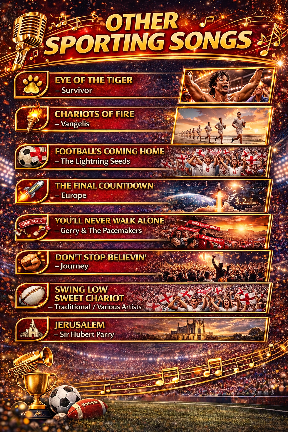 Here are some other sporting songs to enjoy. These well-known favourites are often linked to big sporting moments, crowds, and celebrations. See how many you recognise and feel free to sing along.